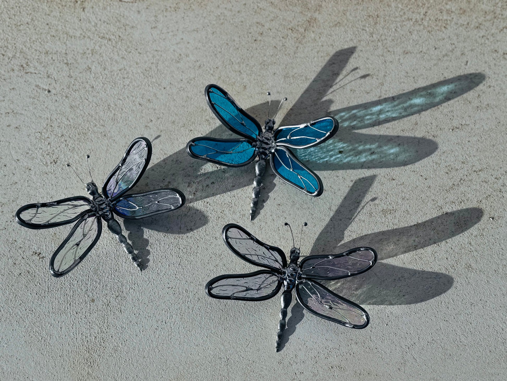 Elke libel is met de hand vervaardigd, waardoor geen twee exemplaren precies hetzelfde zijn. Het glas vangt het licht op een unieke manier, waardoor er telkens weer een ander spel van kleur en schaduw ontstaat – een klein stukje magie aan je raam.